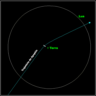 Diagrama mostra a aproximação de Apófis em 2029. O traço branco, perpendicular a trajetória, representa as posições alternativas para o asteróide nessa data. Em nenhum caso ele colide com a Terra. O rasante é visto a olho nu da Europa, África e Ásia ocidental. Adaptado do diagrama de Paul Chodas/NASA/JPL.